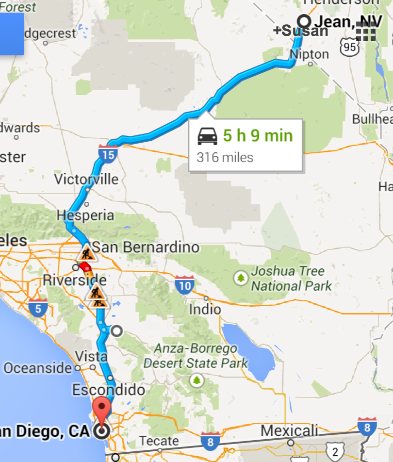 We left Jean, Nevada and headed towards San Diego. We took Route 15 to Route 215 and back into Route 15. People drive a little crazy here. Yes – a Boston driver complaining about other people driving!